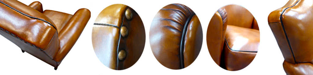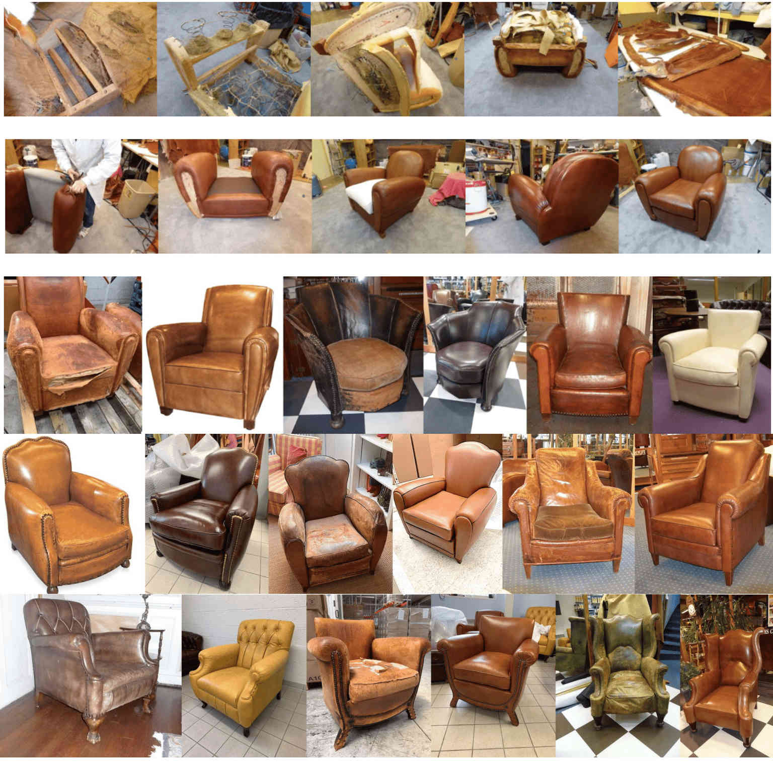 Accoudoirs + Dossiers + assise. Montage, ressorts biconiques cousus sur sangles en toile de jute. Si le cuir de votre fauteuil club est trop abimé pour être restauré partiellement, vous pouvez opter pour une réfection complète.